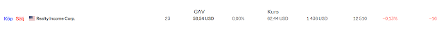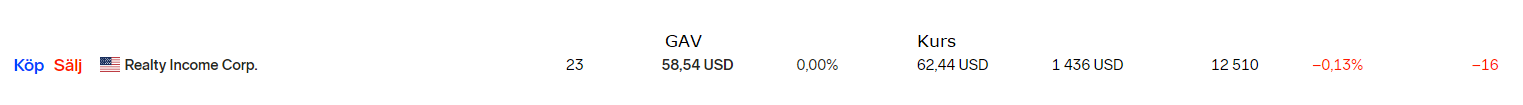 Jag loggade in på min portfölj (vilket jag gör lite för ofta) och studerade mina utländska innehav. Då såg jag att mitt innehav i Realty Income Corp låg $4 över anskaffningsvärdet, vilket motsvarar en vinst på $92. I svenska kronor är det däremot inte lika roligt. Då ligger innehavet på minus.