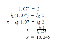 Nu räknar vi ut hur lång tid det tar att fördubbla pengarna med 7 % avkastning om man använder den exakta beräkningen: